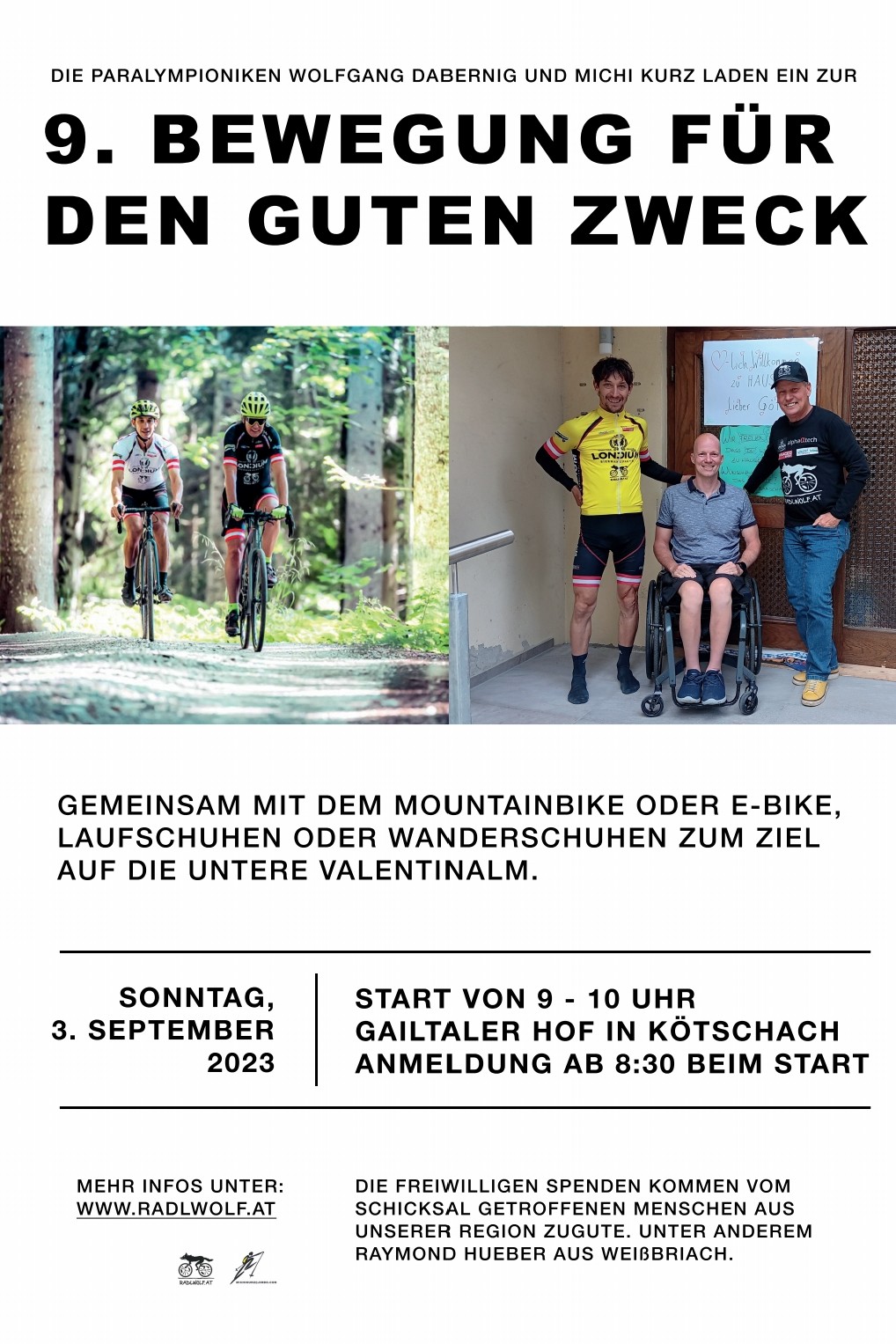 Michi Kurz und Radlwolf möchten aus Dankbarkeit ihr Schicksal nach ihren schweren Unfällen mit der Erstdiagnose Querschnittlähmung so gut gemeistert zu haben mit dieser Veranstaltung anderen Menschen mit Behinderung etwas zurückgeben. Gemeinsam mit dem Mountain- oder E-Bike, Lauf- oder Wanderschuhen von Kötschach auf die Untere Valentinalm Streckenlänge 10,7 km, 530 Höhenmeter
