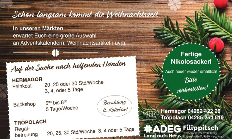 Mit ADEG Filippitsch kann Weihnachten so entspannt sein: große Auswahl an Adventskalendern, alles für das Nikolo Sackerl – fertige Nikolo-Sackerl auf Vorbestellung und viele verschiedene Weihnachtsartikel.